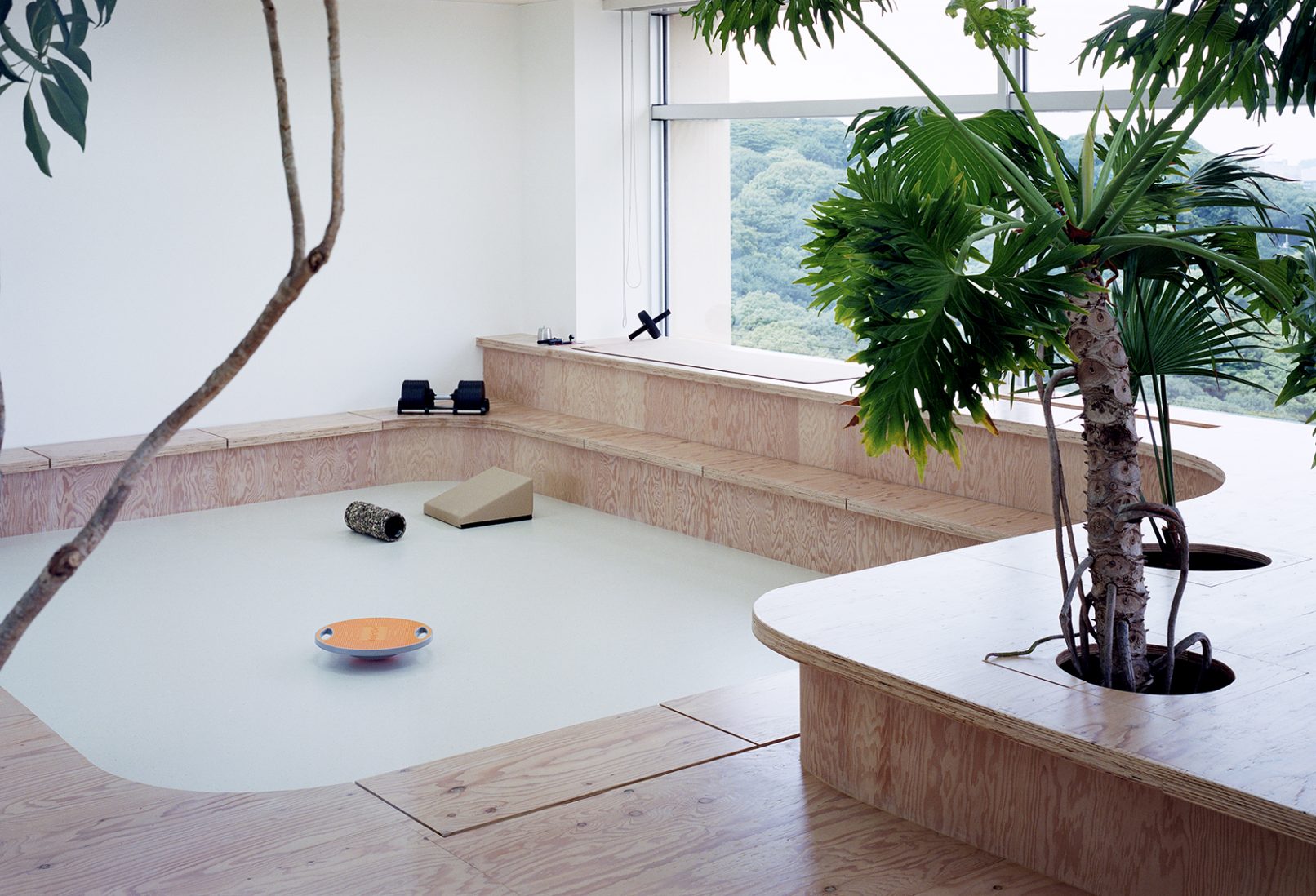 その環境を引き立たせるように、大きな机のような什器を空間に水平に満たした。